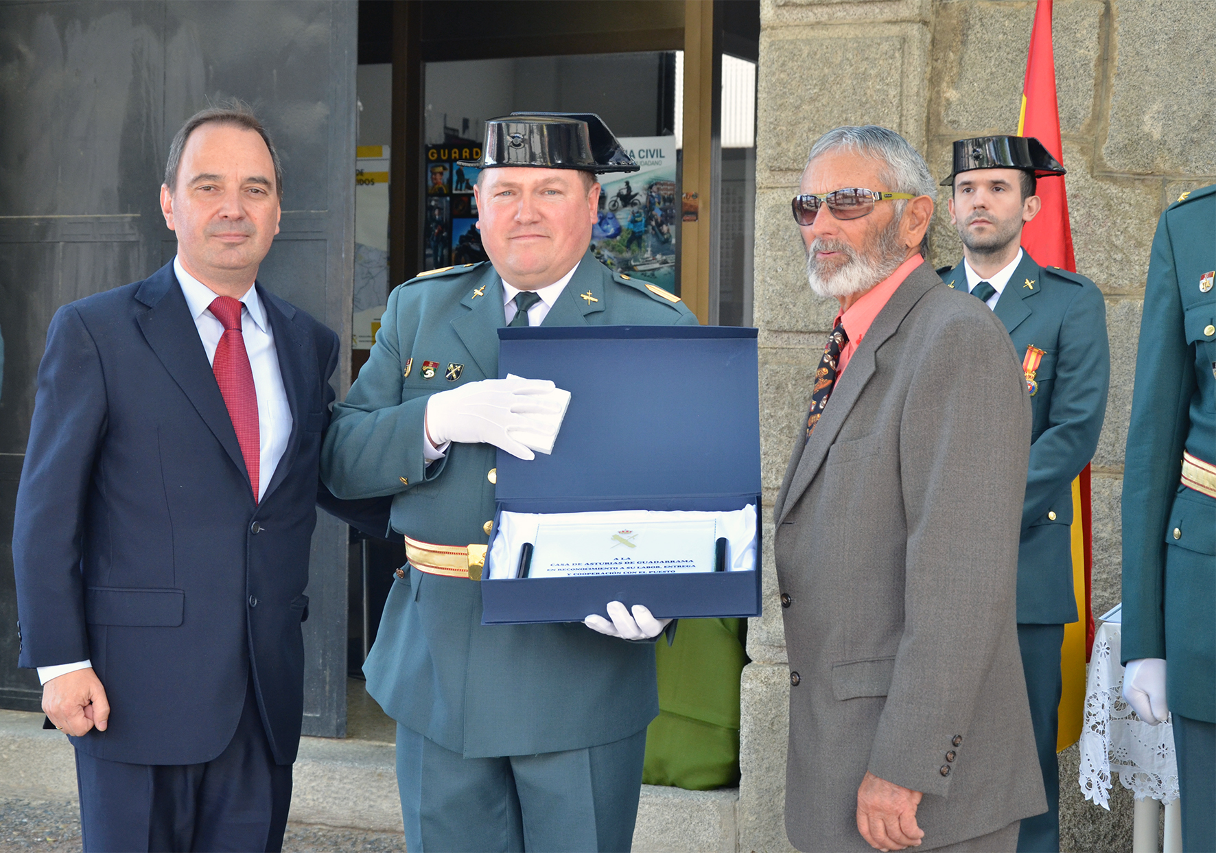 El presidente de la Casa de Asturias en Guadarrama, José Luis G. de la Cera, y Miguel Piña, miembro de la junta directiva, recogieron de manos del Brigada Comandante de Puesto del Cuartel de la Guardia Civil, José Manuel González, una placa en la que se puede leer “A la Casa de Asturias en Guadarrama en reconocimiento a su labor, entrega y cooperación con el Puesto de la Guardia Civil de Guadarrama”.